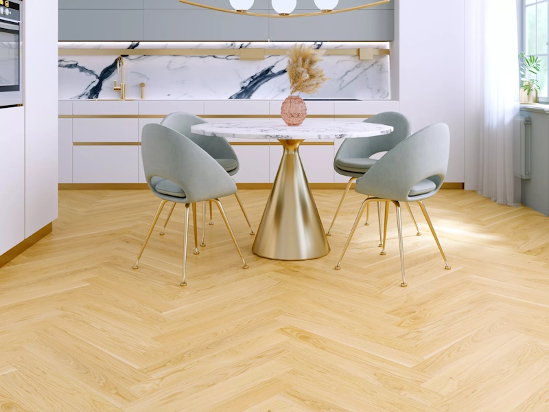 Дополнительный акцент — способ укладки. Геометрия «ёлочка» (Chevron) усиливает ощущение дороговизны и подчеркивает роскошь даже в небольшом пространстве: