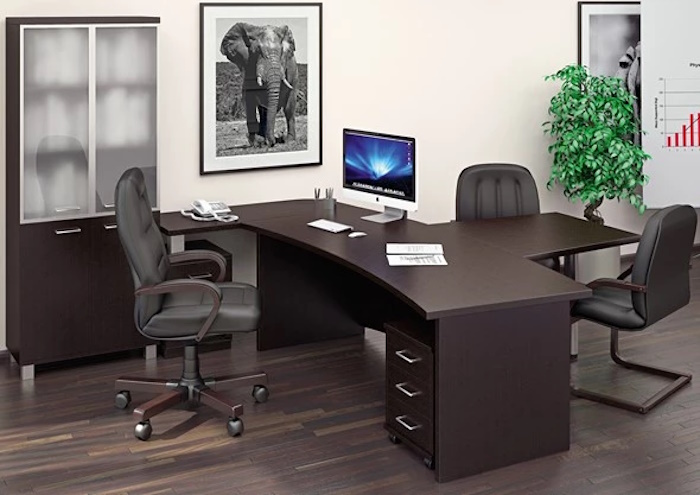- Система хранения — тумбы, шкафы, стеллажи. Важно, чтобы они не перегружали пространство, но при этом вмещали всё необходимое для повседневной работы и деловых встреч.